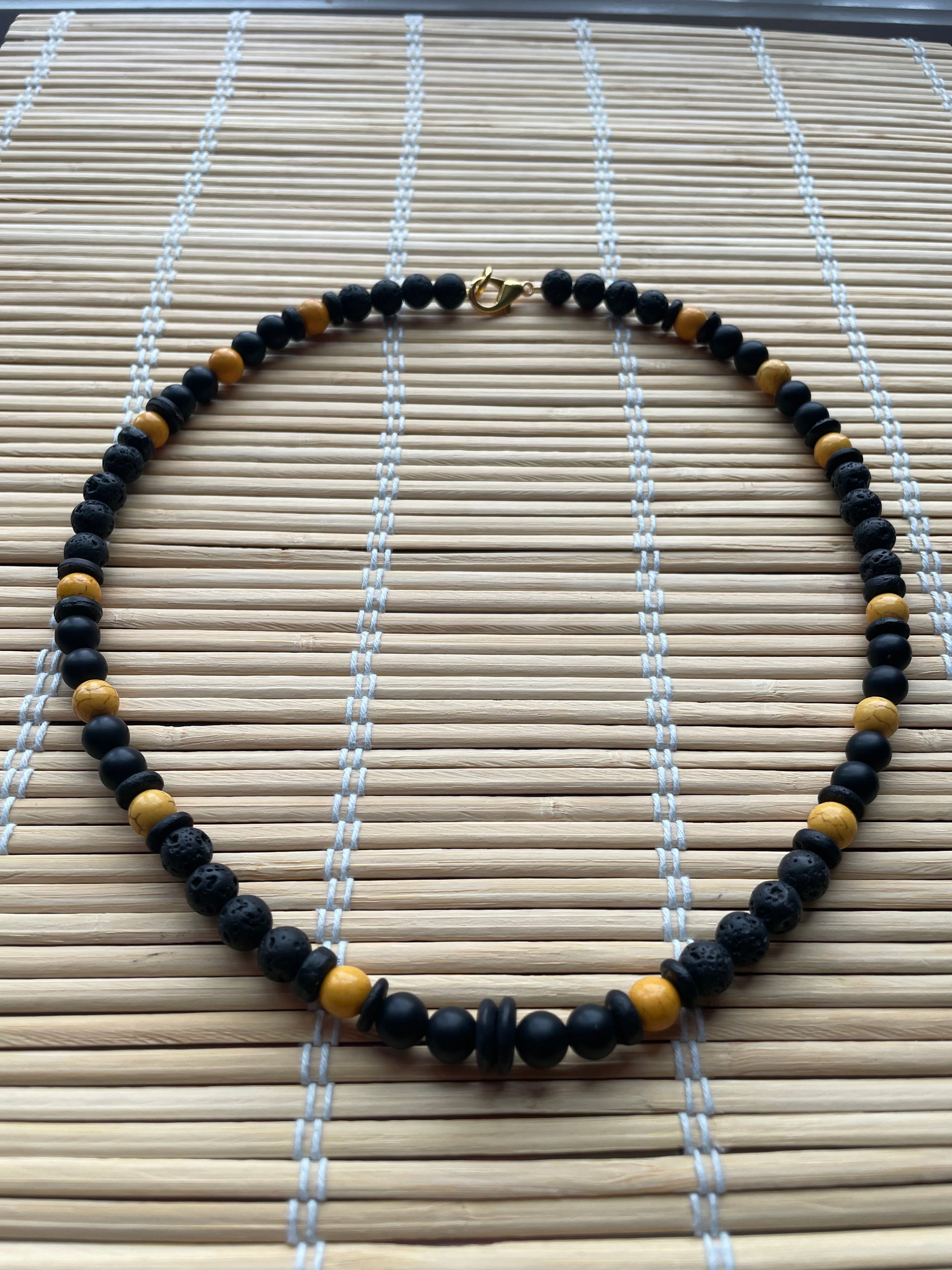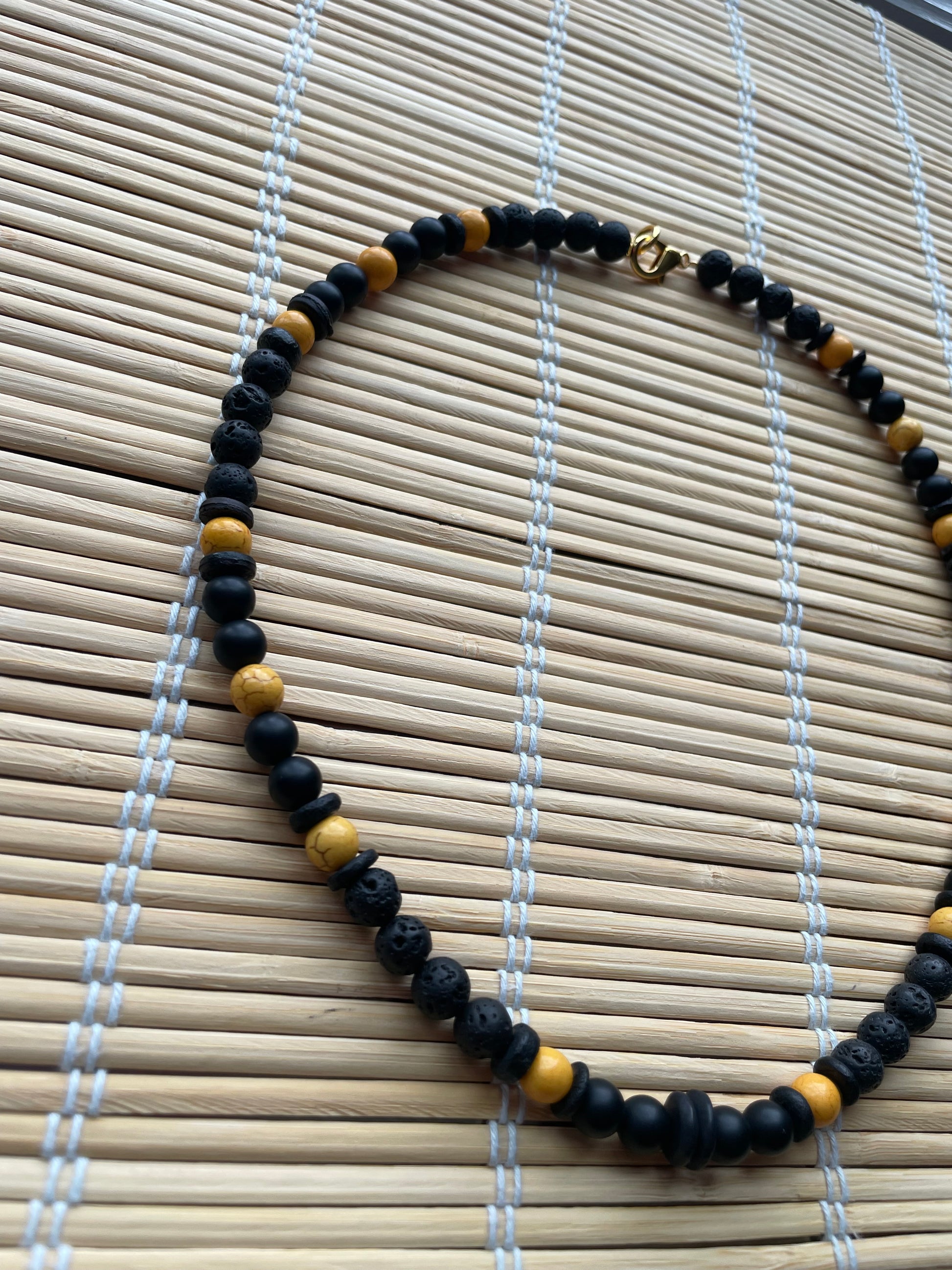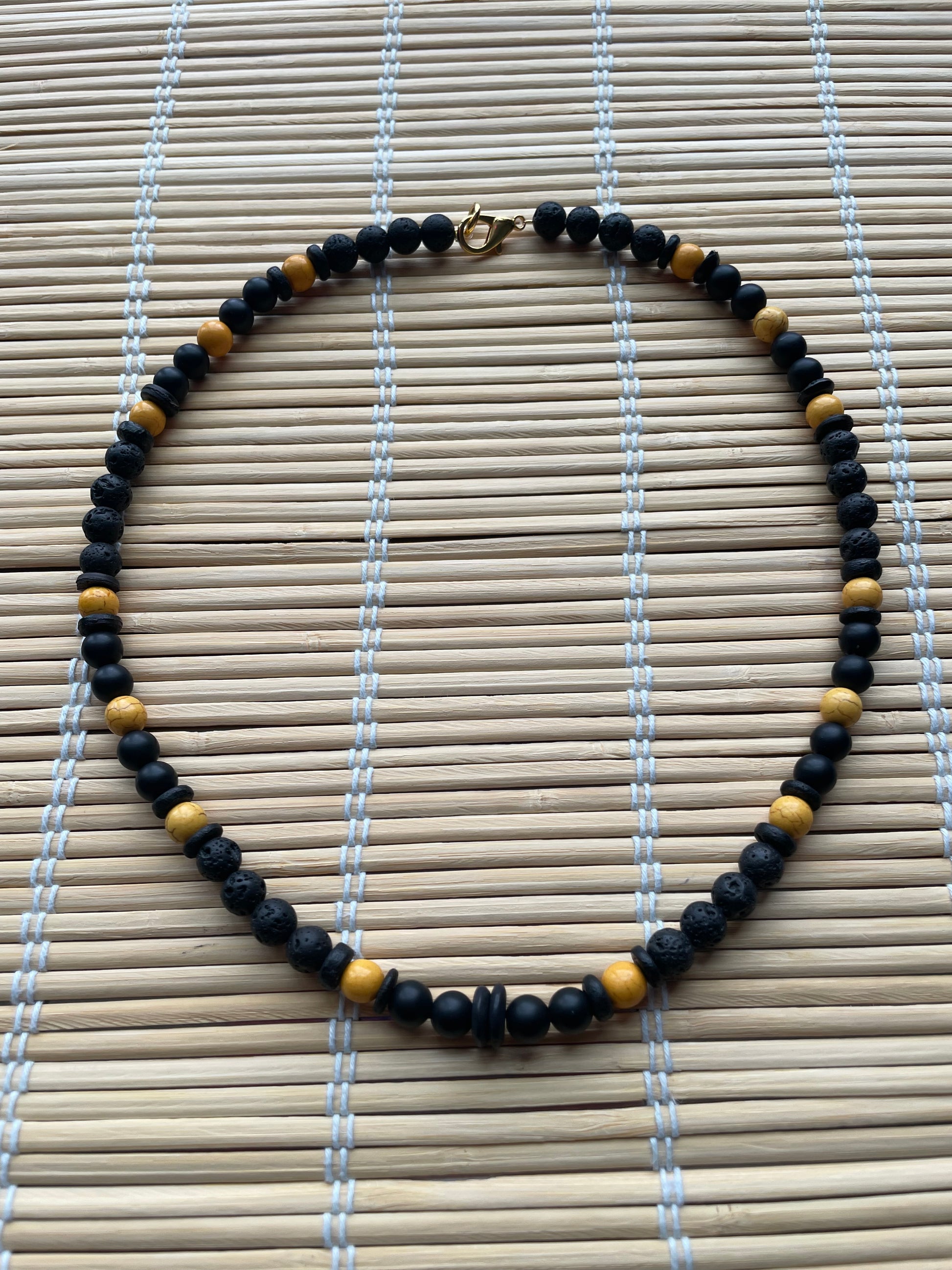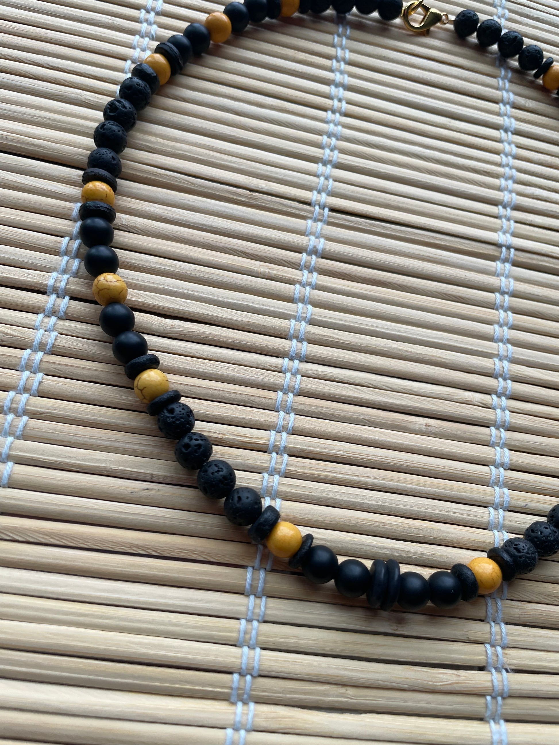 Beautifully made with: Matte black oynx, lava stones, Black coconut beads, yellow Howlite matte, matte black ceramic